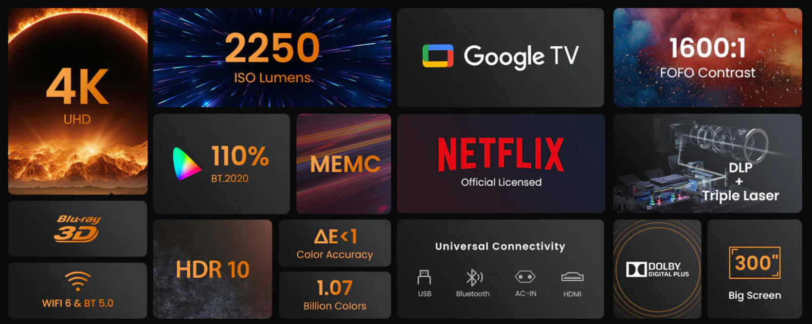 MALC™ 三色激光光學元件 | MT9629芯片 2600 ANSI 流明 內置Google tv YouTube Netflix 4K 激光高清 |110% BT。 2020 |△E<1 色彩準確度 | HDR10 | 1600:1 對比度 雲台投影機| 135° 垂直調整 | 360°水平調整 享受Android TV 11.0帶來的無盡娛樂 身臨其境的DYNAUDIO HiFi音頻體驗| 2*10w杜比數碼喇叭| 數據傳輸系統 自動對焦 | 2GB RAM + 32GB ROM 機身連接 ::HDMI2.1 X2, USB,AUX 無線連接:WIFI6 & 藍牙5.0