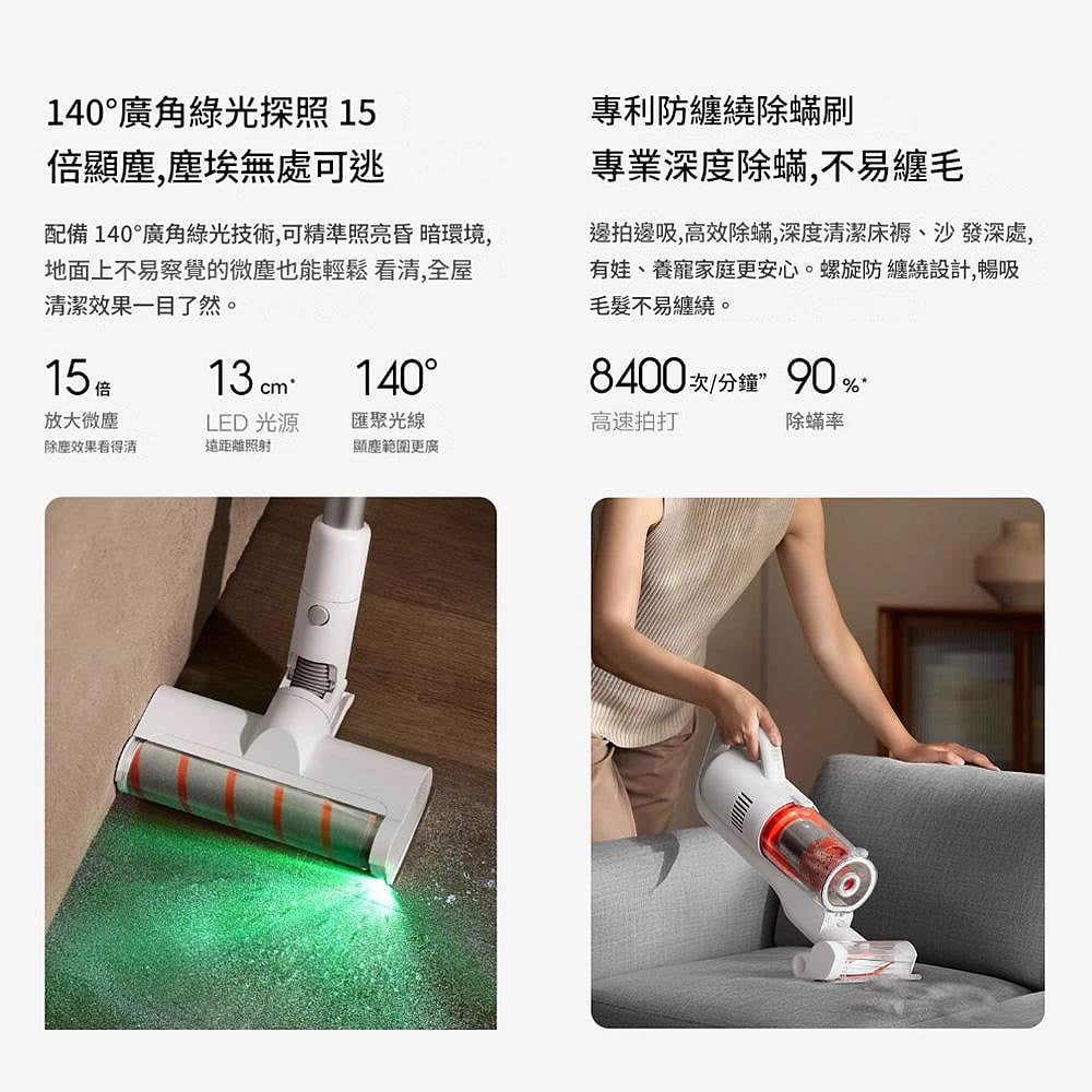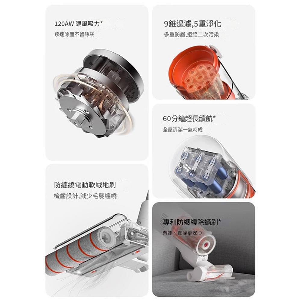 內置輕量化無刷電機,10 萬轉/ 分鐘 電機最大吸入功率120AW 升級9 錐氣旋過濾系統,分離灰塵與氣流,使濾芯不易堵塞 內置2500mAh 電芯,續約約60 分鐘 140° 廣角綠光技術,可照亮昏暗環境,官方稱可實現「15 倍顯塵」 防纏繞軟絨地刷內建獨立馬達驅動,減少毛髮纏繞,防纏繞除蟎刷可清潔床褥、沙發深處 支援180° 清潔,可躺平進入床底、櫃底、沙發底等低矮空間,提供持久、標準和強力三擋吸力模式可選,配備0.5L 容量可視塵杯