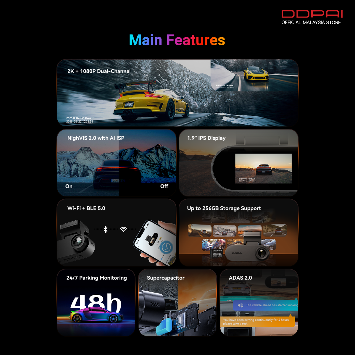 2K QHD + 1080P 雙聲道錄製(前後) NightVIS 2.0 夜視技術,配備 AI 影像訊號處理器 (ISP) 全天候停車監控,配備 IPS 電源管理功能 (需配長火線) ADAS(駕駛員疲勞警告) 1.9 吋全高清螢幕 超級電容(更可靠的電池,具有更好的散熱性能) 藍牙和 Wi-Fi 簡易應用程式連接