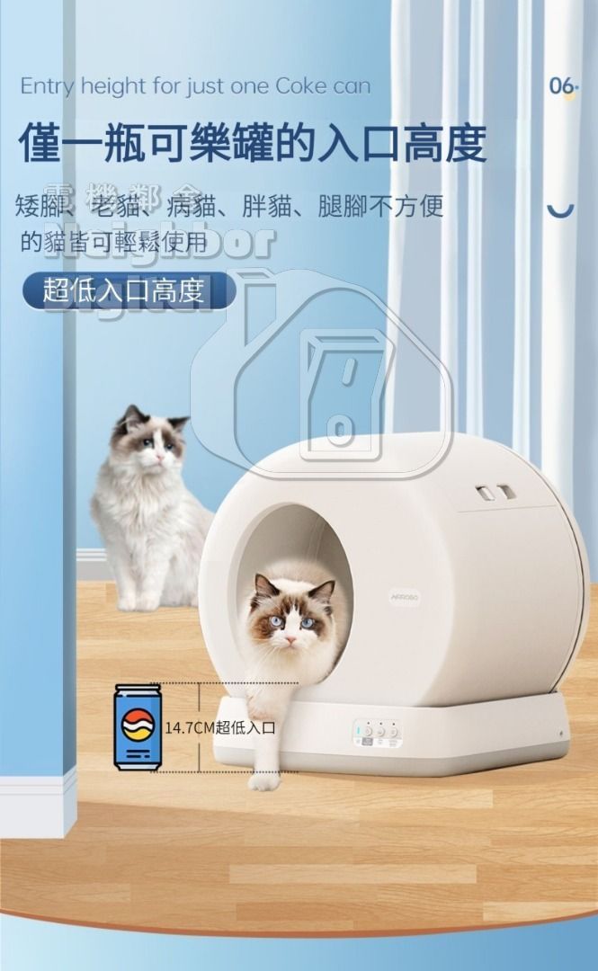 創新結構,專利防夾,雙重安全保障,能做到永不夾貓,擁有 13 重黑科技安全防護,內置釐米波雷達感應器 (機器正前方 120 度,最遠 80cm 的超大範圍保護區域),當貓咪靠近時艙內即可停止工作 集便倉物理除臭,自動感應開合,真正做到臭氣不外溢,筒倉底部為防粘矽膠材質,減少便便沾黏 艙內帶有高清攝像頭,無論身在何方,都可遠端開啟攝像頭,即時關注主子動態情況 APP 智慧管理,全面瞭解主子健康、如廁記錄、體重變化、健康狀況,個性化設置,都能輕鬆掌握 精準識別多隻貓咪,能清楚瞭解每隻貓咪的日常如廁資料 貓咪如廁時間異常,狀況即時提醒 超大空間,不用擔心大胖主子憋屈,內倉 57.6L 超大如廁空間,整機占地面積僅 0.27 平方 14.7cm 超低入口高度,僅一瓶可樂罐的高度,矮貓、老貓、病貓、胖貓、腿腳不方便的貓皆可輕鬆使用 從清砂到清潔機器,絲毫不費力,一鍵清砂,自動感應清潔,也可通過 APP 設置,支持智慧清潔規劃 超簡單的拆洗設計,僅兩步就可完成,女生也能輕鬆搞掂,第一步:打開機器後蓋;第二步:提起滾筒 用袋消費成本僅為同類產品的百分之十,專用濾網,市面各種貓砂都通用 適用對象:貓 (4 個月以上 / 體重 3 – 20KG 內) 艙內容積:57.6L 整機尺寸:520mm X 530mm X 555mm 入口高度:14.7cm (入口大小:232mm X 292mm) 內桶尺寸:480mm X 480mm X 505mm 產品重量:9KG 連接方式:2.4GHz wifi 產品材質:PP、ABS