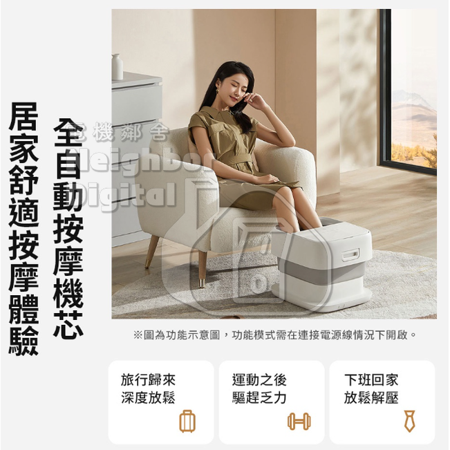 產品特點: - 雙螺旋電動折疊,平穩升降,無需手動展開 - 折疊後面積小,收納不受限 - 全自動按摩機芯,力度、深度達到全新層次 - 腳底分區按摩,針對不同部位,採不同按摩手法 - 足浴軟膠按摩墊,避免直接接觸,按摩同時不傷腳 - DPS加熱系統,水電分離,安全加熱 - 智能控溫技術,告別水溫忽冷忽熱,安心按摩 - 廣域調溫定時,匹配不同用戶的需求喜好 - 米家APP遠程操作,提前設定,到家即可享受 - 小愛語音,說話即可操控 - 底部萬向輪+隱藏伸縮拉手,輕鬆移動 - 隱藏式排水口,一鍵按壓簡單好操作