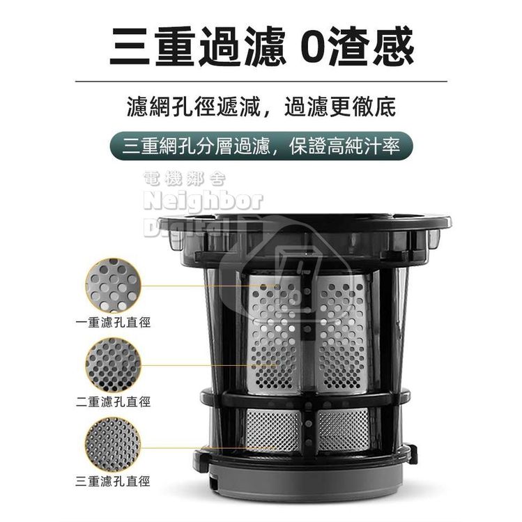 產品特點: - 全新大口徑設計,7.6cm入料口 - 不用切整顆榨,補充維C更方便 - 自動勾料螺旋擠壓專利,原汁不加水更美味 - 97%出汁率,蔬菜水果的營養完全保留 - 仿傳統石磨慢速揉磨,43r/min無刀片 - 石墨豆漿果泥輔食,營養與美味雙重收穫